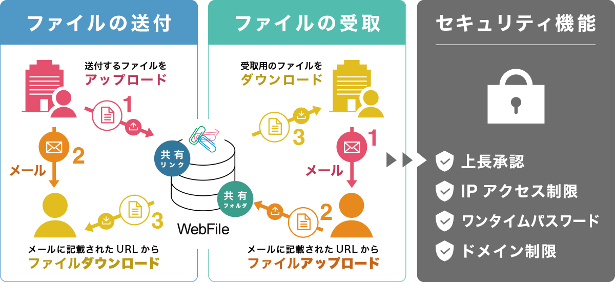 「WebFile」は、企業間の大容量ファイル送受信とストレージ管理を簡易化するサービスです。