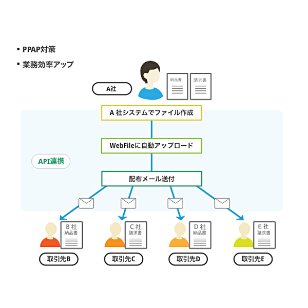 PPAP対策のため、取引先からメール添付でファイル授受がNGに。自社システムとWebFileの配布APIを連携して、PPAP対策と同時に効率もアップ。